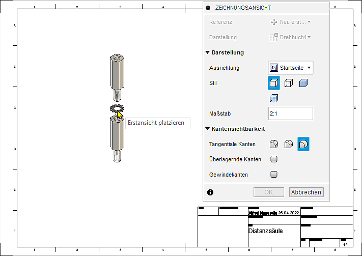 - (Herunterladen) Software CAD - Fusion-Tutorial - Distanzstueck - Baugruppe - Zusammenbau-Zeichnung Erstansicht platzieren.gif . . 711 × 503 . . 21 KB . . Alfred Kamusella . . 08:27, 25. Apr. 2022