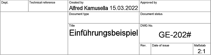 - (Herunterladen) Software CAD - Fusion-Tutorial - Distanzstueck - Schriftfeld - Standardschriftfeld mit Auto-Eintraegen.gif . . 698 × 184 . . 8 KB . . Alfred Kamusella . . 17:25, 22. Mär. 2022