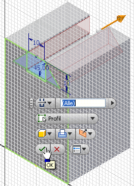 Beide Schrägen sollen im CAD-Modell gemeinsam mittels eines Trapez-Profils durch eine Extrusion hergestellt werden. In der "wirklichen" Fertigung ist es auf Grund der Fräsergrößen meist nur möglich, die beiden Seiten nacheinander herauszufräsen!