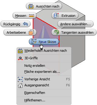 Das Nut-Element kann man auf Basis einer neuen Skizze extrudieren (mit Differenzbildung). Dazu legen wir die erforderliche Neue Skizze (Markierungsmenü) auf die Vorderseite des Quaders. Dabei wird automatisch die Ansicht an der Skizzierebene ausgerichtet: