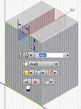 Das "Herausfräsen" der Nut ist nun sehr einfach. Wir wechseln dazu in die Ausgangsansicht <F6>. Beim Element erstellen mittels Extrusion (Kontextmenü) wird als Operation die Differenz-Bildung angewandt (Ausgabe: "Ausschneiden"). Die Extrusion soll durch "alle" Elemente des Bauteils hindurchgehen (zu finden unter: Verhalten - Abstand A: "Durch alle"; der im Bild gezeigte Mini-Werkzeugkasten steht in der aktuellen Inventor-Version nicht mehr zur Verfügung!):