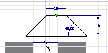 Das Trapez-Profil soll mittig an der oberen Quader-Kante verankert werden. Dabei stört jetzt jedoch die Nut! Wir benötigen in der Lücke eine zusätzliche Linie, welche als Ersatz für die Kante des Rohteils dient. Diesmal beobachten wir ganz bewusst die beim Zeichnen automatisch erzeugten Abhängigkeiten (koinzident Linienend-Punkt auf Eck-Punkt!):
