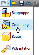 • Bis zur Inventor-Version 2014 wurden Zeichnungen standardmäßig in sogenannten Inventor-Draw-Dokumenten (.idw) gespeichert. Seit der Version 2015 wird jedoch der Dateityp .dwg verwendet, wenn man eine neue Zeichnung direkt unter dem Button des Schnellzugriff-Werkzeugleiste öffnen würde (Siehe rechtes Bild).