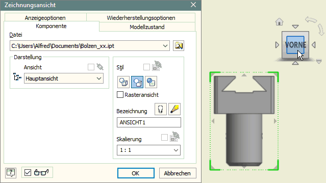 • Im Dialog wird die Verknüpfung mit der Datei des abzubildenden Bauteils hergestellt (Bolzen_xx.ipt):