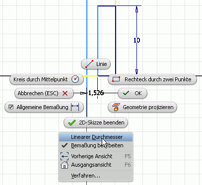 - Etwas umständlicher ist die Bemaßung des Zapfendurchmessers, weil nur zwei Linien im Radius-Abstand in der Skizze existieren: