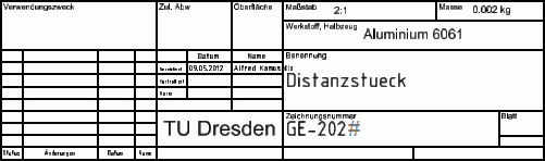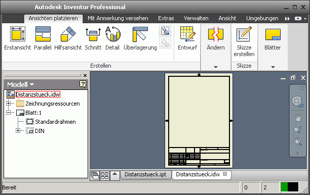 In Analogie zur Vorlagendatei Norm.ipt für Bauteile existiert auch eine Vorlagendatei Norm.idw für Zeichnungen. Leider muss das Schriftfeld in dieser Zeichnungsvorlage erst mit Hilfe eines speziellen Editors an die konkreten Anforderungen einer Firma angepasst werden. Das soll aber nicht Inhalt dieser Einführungsübung sein. Deshalb verwenden wir die Datei BONUS2020_xx.idw. Wir kopieren sie aus dem bereitgestellten ZIP-Archivfile in den Projekt-Ordner der eigenenDokumente und benennen sie dort in Distanzstueck.idw um.