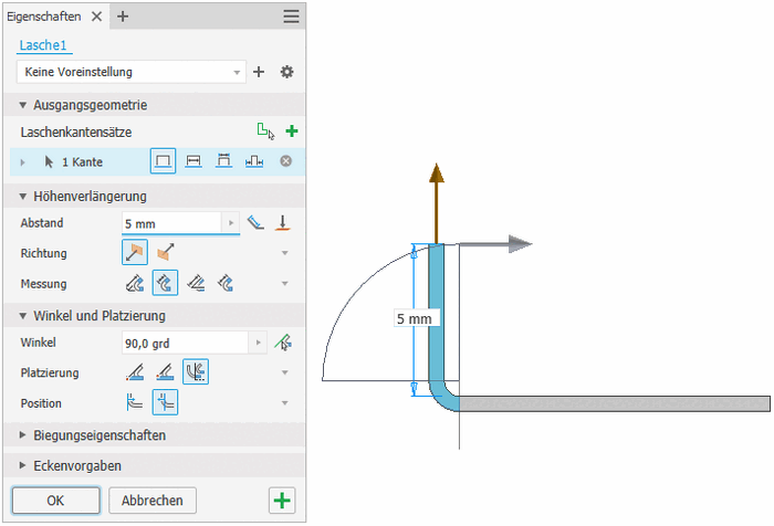- Wir erzeugen eine Lasche an der Vorderkante des Ausgangsblechs im 90° Winkel nach oben mit einer Länge von 5 mm. Die Höhengrenze soll sich auf die Innenfläche beziehen und die Biegeposition an der angrenzenden Fläche beginnen: