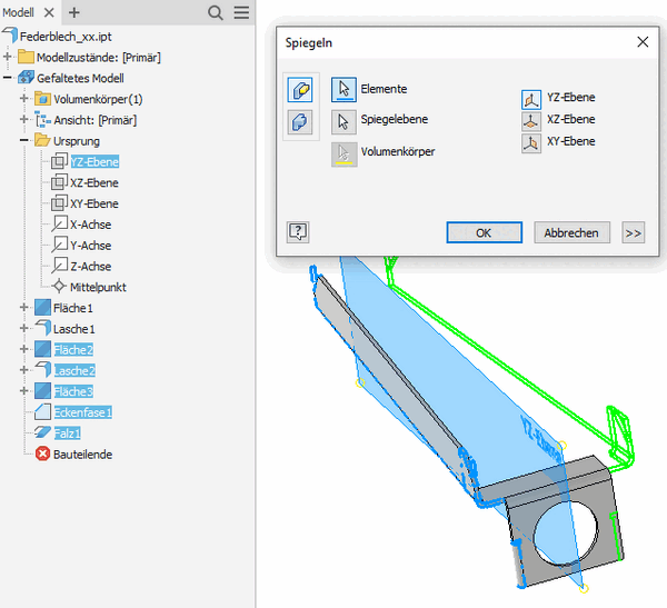 - Es werden alle Features außer der Ausgangsfläche und der ersten Lasche um die Y-Z-Ebene gespiegelt: