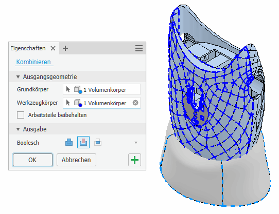 . - Grundkörper ist die Freiformgeometrie, Werkzeugkörper die erste Hälfte des Gehäuses. Die Operation soll Ausschneiden sein.