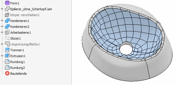 Zur Übung des Umgangs mit Freiformen möchten wir eine Ladeschale für den Epilierer gestalten. Wir nutzen dazu die zweite Möglichkeit der grafischen Manipulation von Freiformflächen. Dabei wird relativ schnell ein Nachteil dieses Vorgehens im Vergleich zu unserer bisherigen Arbeit auffallen: