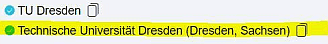 • Wird an der Hochschule mit Shibboleth gearbeitet, erfolgt bei richtiger Wahl der Hochschule eine Weiterleitung an das Single Sign-On der Bildungseinrichtung (ohne zusätzlicher Abfrage von Unterlagen). Leider taucht z.B. die TU Dresden 2x in der Auswahlliste auf. Man muss hier den "richtigen Eintrag" wählen (im folgenden Bild gelb markiert), damit eine direkte Weiterleitung an das Prüfverfahren erfolgt: