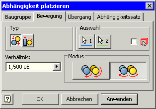 - Mit Hilfe von Bewegungsabhängigkeiten kann man beabsichtigte Bewegungsverhältnisse zwischen zwei Baugruppenkomponenten definieren ("Drehung-Drehung" bzw. "Drehung-Translation".