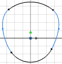 - Festlegen der zugehörigen Radien durch die Länge der Hilfs-Linien. Die Symmetrie der Kurve beschreibt man zuvor durch die Abhängigkeiten "Symmetrisch" und "Gleich" zwischen den strahlenförmigen Hilfslinien (zu den Spline-Zwischenpunkten). Die Lage der Zwischenpunkte steuert den Verlauf der Splines. Im Beispiel ergibt sich deren Radius=55 mm aus dem Mittelwert der Kreisbögenradien: