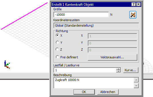 - Nach Auswahl der Kante kann man den Vektor der Kraft definieren: