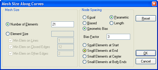 - Wir steuern dies über einen geometrischen Bias-Faktor=3 (Bias .. englisch für "Verzerrung") beim Festlegen der Elemente-Anzahl pro Viereck-Kante (Size Along Curve). Hier am Beispiel der Höhenteilung des Gummi: