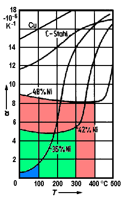 Die Schicht mit dem geringeren Ausdehnungskoeffizienten bezeichnet man auch als passive Komponente eines Thermobimetalls. Für die passive Komponente wird häufig eine Nickel-Eisen-Legierung eingesetzt. Am bekanntesten ist sicher FeNi36 (Handelsname Invar), das im Temperaturbereich bis 100°C den geringsten Ausdehnungskoeffizienten aller Metalle aufweist. Für höhere Temperaturen nutzbar sind z.B. FeNi42 bzw. FeNi48, mit ziemlich konstanten Ausdehnungskoeffizienten bis 300°C bzw. 400°C (Bild rechts - Quelle: www.burde-metall.at).