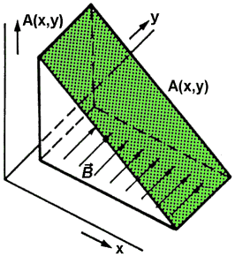 • Das Bild soll den Zusammenhang zwischen dem Vektorpotential A und der Induktion B am Beispiel eines homogenen Magnetfeldes verdeutlichen. Die grüne Fläche repräsentiert das berechnete Vektorpotential. Der negative Anstieg an der Fläche entspricht im Beispiel dem Wert der Induktion in y-Richtung.