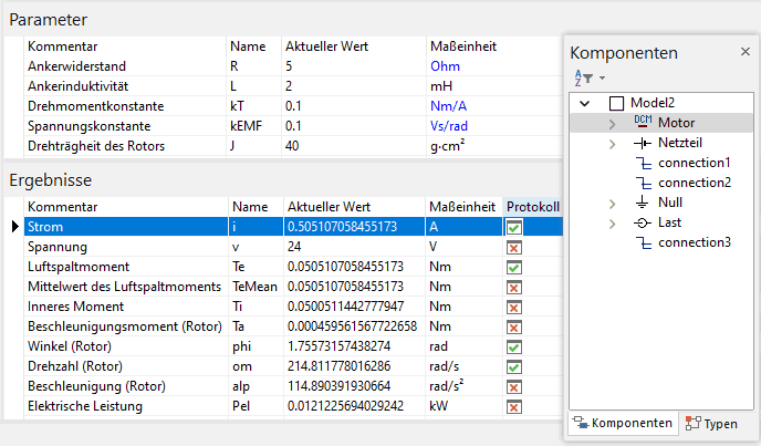 - Wahl des Elements Motor in der Modellstruktur-Ansicht oder im Modellexplorer. Der aktuelle End-Wert des Motorstroms erscheint in der zugehörigen Liste der Ergebnisse (unabhängig davon, ob das Ergebnis als Signal aktiviert wurde):