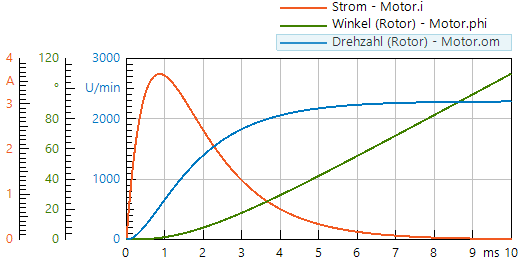 Wenn ein elektrischer Strom durch die Spule des Motors fließt, wird ein Drehmoment erzeugt und der Motor beginnt sich zu drehen. Diesen Vorgang werden wir jetzt mit dem Modell simulieren. Zusätzlich zum Strom wollen wir das Drehmoment des Motors als Signalverlauf darstellen:
