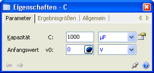 - Kapazitätswert nach Doppelklick auf das Symbol erscheint der Eigenschaftsdialog. In der Registerkarte Parameter erhöhen wir den Wert für C auf 1000 µF. Der Anfangswert v0=0 V definiert einen entladenen Kondensator.