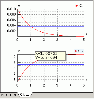 - Dabei werden wir feststellen, dass wir gewünschte "exakte" Zeitpunkte (z.B. 1 s) mit dem Cursor nicht ansteuern können! Auf Grund der variablen Simulationsschrittweite dt ist das auch sehr unwahrscheinlich. Solche Zeitpunkte müsste man innerhalb des Modells zuvor als "Ereignisse" definieren.