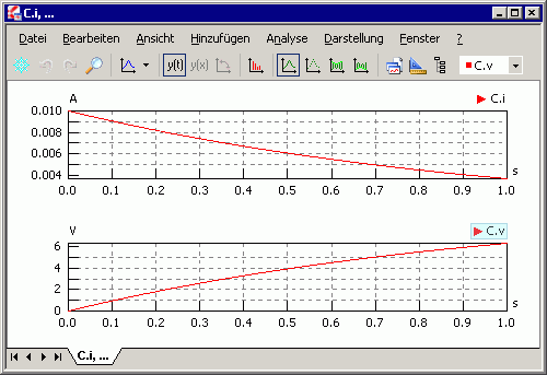 - Standardmäßig wird ein Zeitbereich von tStart=0 s bis tStop=1 s simuliert. In unserem Beispiel ist in dieser Zeit der Aufladevorgang des Kondensators noch nicht beendet.