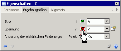 - Wenn wir im Beispiel den Strom durch den Kondensator und die Spannung am Kondensator aufzeichnen möchten, so müssen wir diese Funktion zuvor aktivieren (Kondensator > Eigenschaften > Ergebnisgrößen):