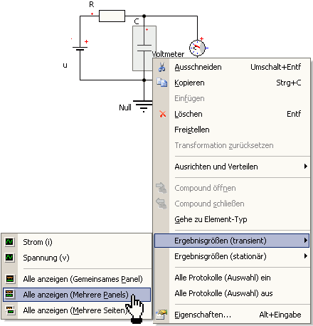 - Damit man den Verlauf aufgezeichneter Signalgrößen bei der Simulation betrachten kann, muss man zuvor diese Ergebnisgrößen für die Darstellung auswählen (mittels rechten Mausklick auf den Kondensator):