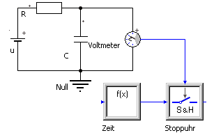 - Das Ausgangssignal des Voltmeters benutzen wir als Steuersignal s der Stoppuhr.
