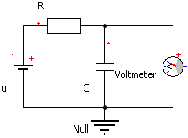 - Würden wir diese Schaltung als "materiellen" Versuchsstand aufbauen, so könnte man bei einer hinreichend großen Kondensator-Kapazität am Voltmeter beobachten, wie sich der Kondensator bis zur Ausgangsspannung des Netzteils auflädt. Solche Versuche sollten aus dem Physikunterricht bekannt sein. Nur so erhält man die Chance, ein Gefühl dafür entwickeln, dass es z.B. "funkt", wenn man den Reihenwiderstand vergisst. Und dass es gewaltig "funkt", wenn man den aufgeladenen Kondensator mit einem Draht kurzschließt. Außerdem erhöht die Reaktion des Physiklehrers auf solche Ereignisse zusätzlich die soziale Kompetenz des Experimentierenden.