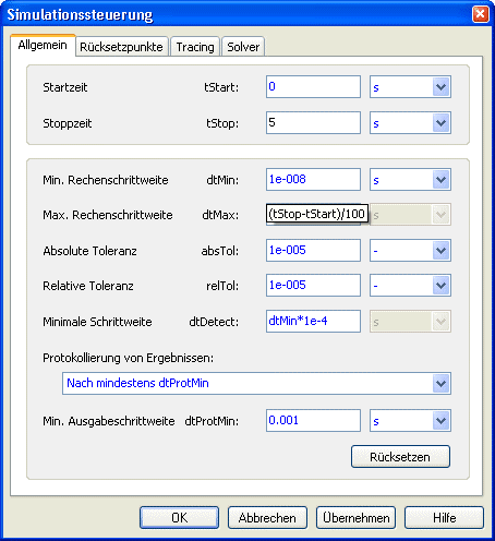- dtMin ist die kleinste zulässige Schrittweite. Bei stark untetigen Modellen kann man diese Bedarf bis ca. 1e‑20 s verringern. Wir verringern die Standardvorgabe von 1e‑8 s auf dtMin=1e‑12 s.