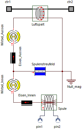 • Der äußere Eisenabschnitt liegt in der Modellstruktur parallel zum Spulen-Streufeld. Bei schnellen Flussänderungen bewirkt das Wirbelstrom-Element ein Vergrößern des magnetischen Widerstandes des Eisen-Flusszweiges. Der magnetische Fluss wird damit durch das Streufeld der Spule "gedrückt" und geht damit dem eigentlichen Arbeitskreis für diese Zeitspanne verloren.