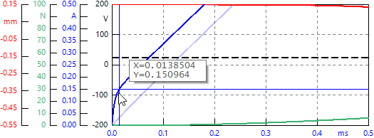 • Trotz der Änderung des Stromverlaufs beim Einschalten, ist die Auswirkung auf den Anzugsvorgang kaum erkennbar. Die Ursache liegt in der vereinfachten Modellierung des Wirbelstroms. Die Feldverdrängung innerhalb des Eisenquerschnitts wird damit nicht nachgebildet. Somit wirkt im Modell jetzt ein größerer effektiver Eisenquerschnitt als in der Realität.