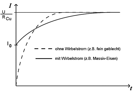 • Der Stromsprung I0 resultiert aus dem praktisch sofort fließenden Wirbelstrom mit seinen ohmschen Verlusten in den Eisen-Elementen. Diese Verlustenergie EW=U·I0 wird von der Spannungsquelle sofort bereitgestellt.
