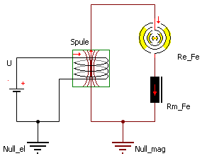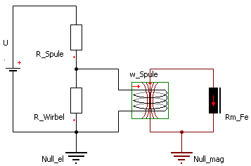 • Dieser ohmsche Widerstand R_Wirbel muss direkt parallel zu den widerstandslosen Windungen der Spule angeordnet werden. Dazu müsste man im SimulationX-Spulenelement Rel=0 setzen!