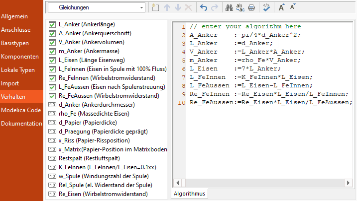 1. Alle für die Dimensionierung benötigten Größen werden als Parameter bzw. Variable im Komponenten-Abschnitt definiert.