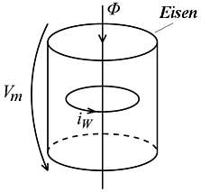 • Die Wirbelströme bewirken über die ohmschen Verluste entlang ihrer Bahn eine Erwärmung des Eisenmaterials. Insbesondere beim Einschaltvorgang bilden sie eine wesentliche Komponente der Eisenverluste.