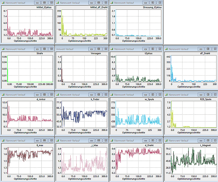 Die einzelnen Lösungspunkte repräsentieren jeweils eine Stichprobe, die im Rahmen der co-evolutionären Optimierungsstrategie berechnet wird. Der Verlauf der Co-Evolution widerspiegelt sich in den Nennwert-Diagrammen der variablen Entwurfsparameter und der Bewertungsgrößen des Experiments: