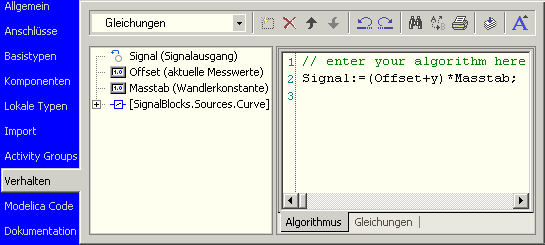 - Da Mess-Signale meist mit einem Offset-Wert belastet sind und man auch einen Umrechnungsfaktor zwischen aufgezeichneten Messwerten und tatsächlicher physikalischer Dimension benötigt, wurde von dem Bibliothekstyp Kennlinie ein neuer Modelltyp NewCurve1 abgeleitet und als lokaler Element-Typ im Modell definiert: